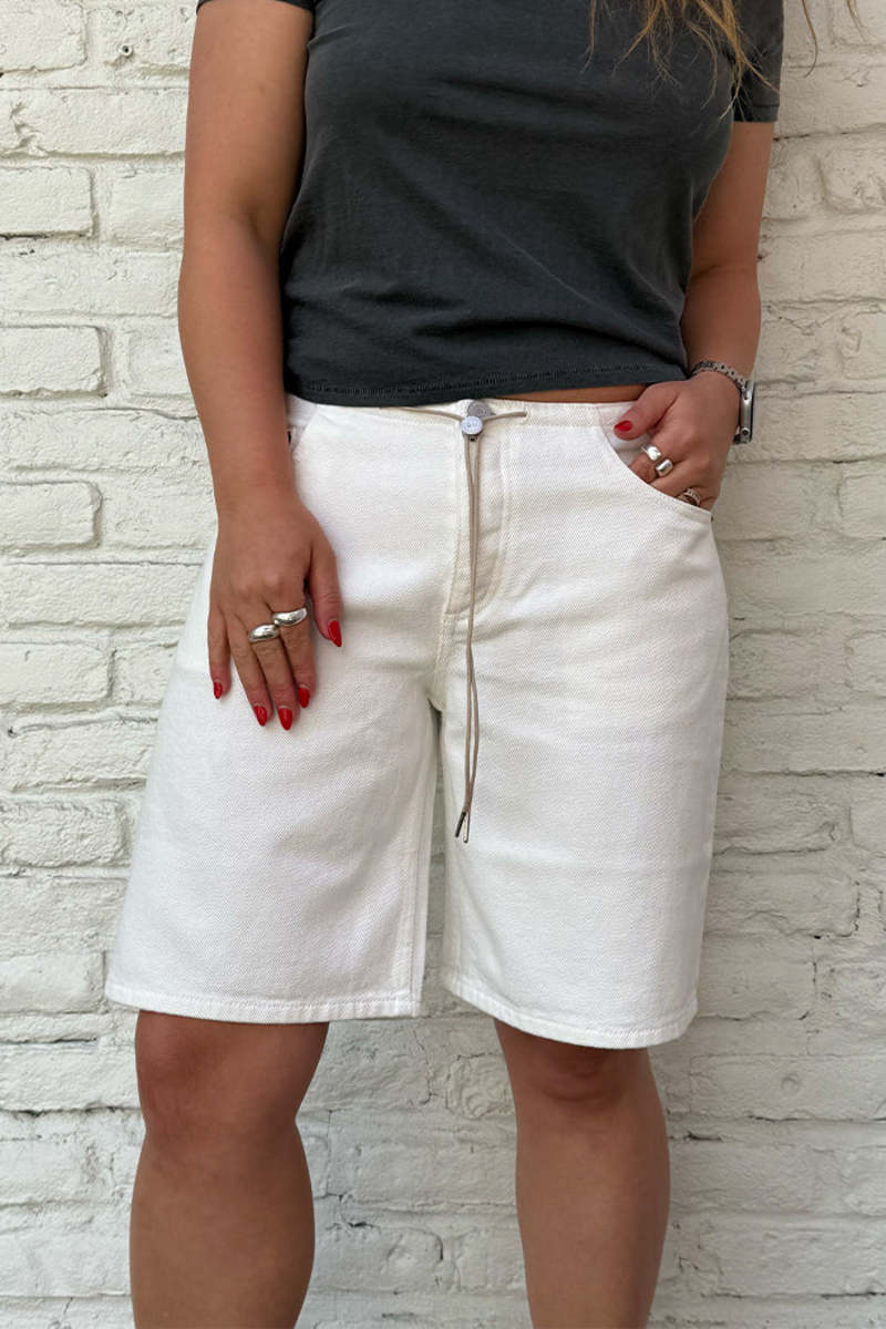 The Cool Shorts are inspired by our best-selling Cool Jean style. They are relaxed leg, low-rise jean shorts with an adjustable drawstring toggle. The Cool Shorts have no waistband. They are designed to hit just above the knee and feature a traditional button fly, custom hardware.
